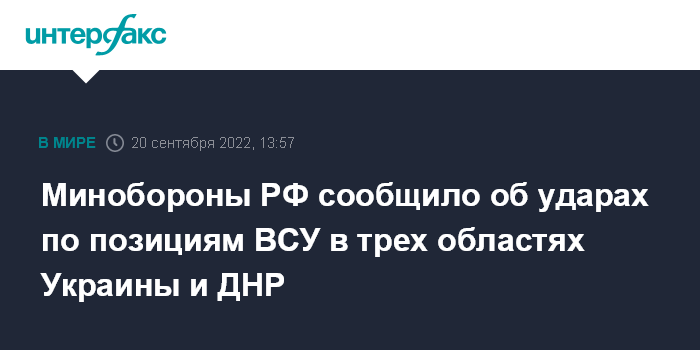 Москва. 20 сентября. INTERFAX.RU - Российская армия за минувшие сутки нанесла удары по позициям Вооруженных сил Украины (ВСУ) в Харьковской, Николаевской, Херсонской областях и ДНР, сообщил официальный представитель министерства обороны РФ Игорь Конашенков.