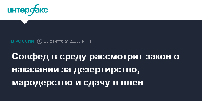 Москва. 20 сентября. INTERFAX.RU - Совет Федерации на заседании в среду рассмотрит закон с поправками в УК РФ о наказании за дезертирство, мародерство и сдачу в плен, сообщил глава Комитета СФ по конституционному законодательству и госстроительству Андрей Клишас.