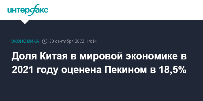 Москва. 20 сентября. INTERFAX.RU - Доля Китая в мировой экономике в 2021 году составляла 18,5% при пересчете на среднегодовые курсы обмена валют по сравнению с 11,3% в 2012 году, говорится в отчете Государственного статистического управления (ГСУ) страны. Об этом сообщает "Синьхуа".
