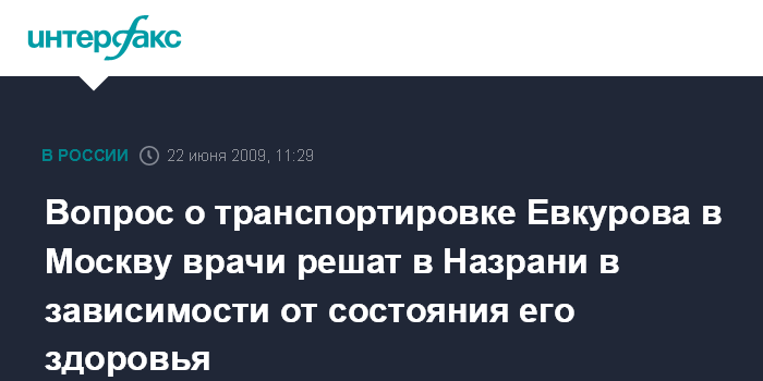 Москва. 22 июня. INTERFAX.RU - Вопрос о транспортировке президента Ингушетии Юнус-Бека Евкурова, получившего ранение в результате теракта, в федеральную клинику будет решаться медиками на месте в зависимости от состояния его здоровья, сообщили "Интерфаксу" в понедельник в Минздравсоцразвития РФ.