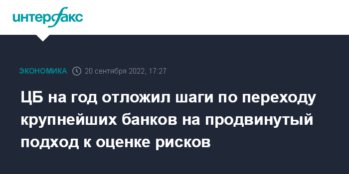Москва. 20 сентября. INTERFAX.RU - ЦБ РФ на год отложил мероприятия по переходу системно значимых кредитных организаций на продвинутый подход к оценке кредитных рисков (Internal Ratings-Based Approach, IRB-подход или ПВР-подход), говорится в ответах ЦБ на вопросы и предложения банков по итогам ежегодной встречи, проведенной Ассоциацией банков России в мае этого года.