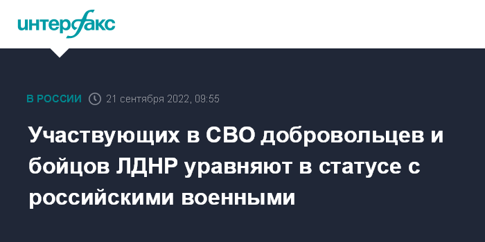 Москва. 21 сентября. INTERFAX.RU - В обращении к россиянам президент Владимир Путин сказал, что поручил правительству и Министерству обороны определить правовой статус добровольцев и бойцов подразделений Донецкой и Луганской народных республик, которые участвуют в спецоперации на Украине.