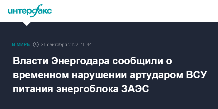 Москва. 21 сентября. INTERFAX.RU - АЭС в Энергодаре на подконтрольной РФ части Запорожской области в ночь на среду подверглась очередному артиллерийскому обстрелу со стороны вооружённых сил Украины, повреждено оборудование связи одного из энергоблоков, сообщили журналистам в пресс-службе администрации города.