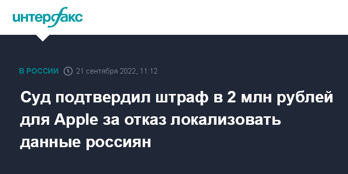 Москва. 21 сентября. INTERFAX.RU - Таганский суд Москвы отклонил апелляцию Apple Inc, которая оспорила назначенный ей штраф в 2 млн рублей за отказ локализовать данные россиян на территории России, передает корреспондент "Интерфакса".