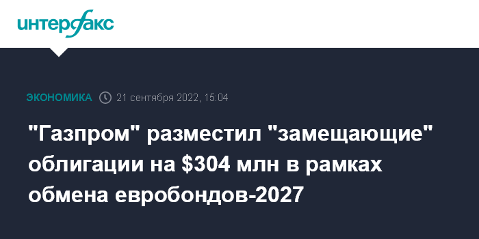 Москва. 21 сентября. INTERFAX.RU - "Газпром капитал" разместил "замещающие" облигации на $304,401 млн в рамках обмена еврооблигаций с погашением в 2027 году на локальные долговые бумаги.