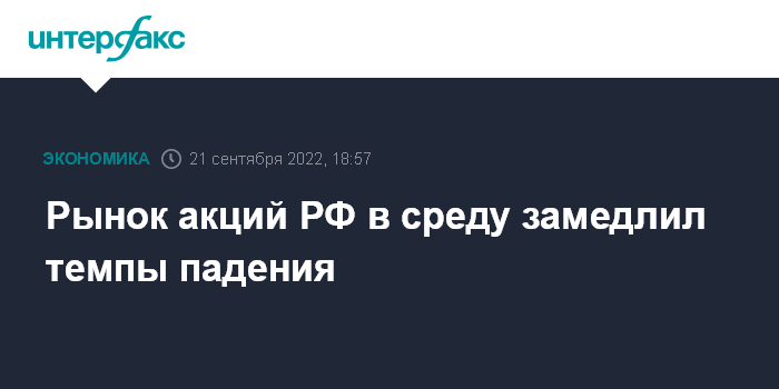 Москва. 21 сентября. INTERFAX.RU - Рынок акций РФ в среду продолжил снижение из-за возросших геополитических рисков на фоне известий о введении частичной мобилизации в России в связи с ситуацией на Украине, однако темпы падения сократились; индекс МосБиржи консолидировался в районе 2130 пунктов после утреннего локального отката к 2000 пунктам (минимум с 24 февраля).