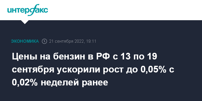 Цены на бензин в РФ с 13 по 19 сентября ускорили рост до 0,05% с 0,02% неделей ранее