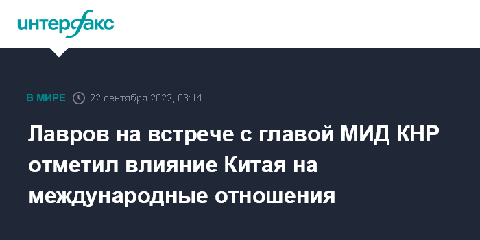 "Буквально через несколько дней состоится 20-й съезд Коммунистической партии Китая. К этому важнейшему событию приковано внимание всего мира. Мы убеждены, что наши китайские друзья завершат съезд на позитивных договоренностях о дальнейшем развитии своей страны, своего общества и договоренностях и решениях о том, как Китайская Народная Республика будет продолжать способствовать установлению демократичных, справедливых правил на международной арене в соответствии с принципами Устава ООН", - сказал Лавров на встрече с министром иностранных дел КНР Ван И.