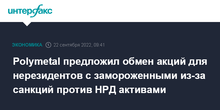 Москва. 22 сентября. INTERFAX.RU - Polymetal предложил решение проблемы активов, замороженных из-за санкций Евросоюза против Национального расчетного депозитария, посредством обмена акций для нерезидентов.