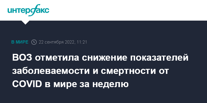 Москва. 22 сентября. INTERFAX.RU - Всемирная организация здравоохранения (ВОЗ) констатирует снижение уровня заболеваемости и смертности в результате COVID-19 в мире за минувшую неделю.