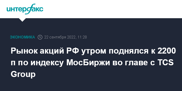 Москва. 22 сентября. INTERFAX.RU - Рынок акций РФ утром в четверг растет в рамках коррекции после двухдневного обвала из-за увеличения геополитических рисков, отскок сдерживается негативной внешней конъюнктурой на фоне ужесточения монетарной политики Федрезерва и намерениями ЕС ввести новые антироссийские санкции. Индекс МосБиржи поднялся к рубежу 2200 пунктов во главе с расписками TCS Group, при этом упали акции Polymetal на дивидендных новостях.