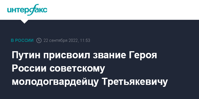 Москва. 22 сентября. INTERFAX.RU - Президент Владимир Путин своим указом присвоил посмертно Виктору Третьякевичу звание Героя России за активное участие в создании подпольной комсомольской организации "Молодая гвардия" и мужество, проявленное во время Великой Отечественной войны.