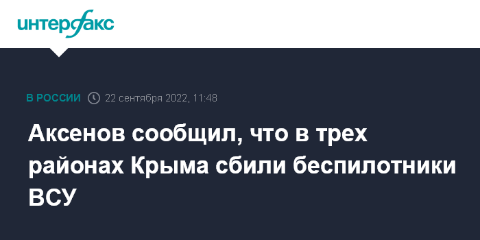 Москва. 22 сентября. INTERFAX.RU - Беспилотные летательные аппараты Вооруженных сил Украины (ВСУ) удалось сбить в четверг в трех районах Крыма, сообщил глава республики Сергей Аксенов в своем телеграм-канале.