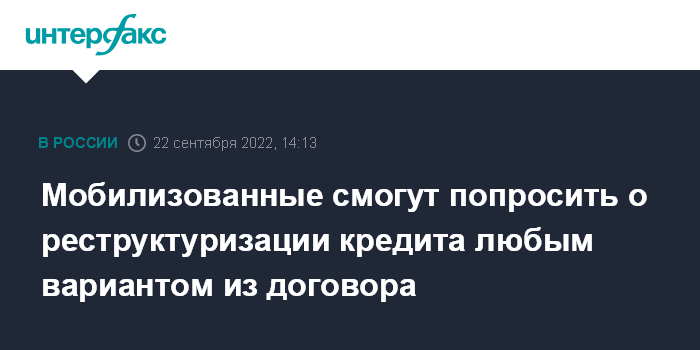 Москва. 22 сентября. INTERFAX.RU - Мобилизованные граждане могут подать обращение о реструктуризации по кредитам любым способом, предусмотренным кредитным договором или договором займа, говорится в разъяснениях на сайте ЦБ РФ.