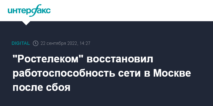 Москва. 22 сентября. INTERFAX.RU - Пользователи "Ростелекома" в Москве в четверг столкнулись со сбоями доступа в интернет, компания заявляет, что работоспособность сети уже восстановлена.