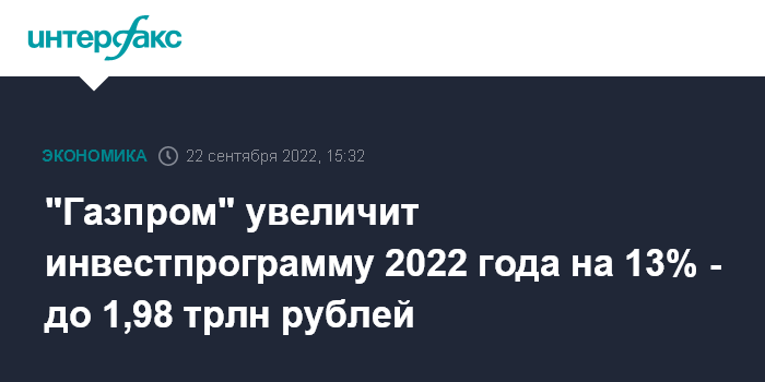 "Газпром" увеличит инвестпрограмму 2022 года на 13% - до 1,98 трлн рублей