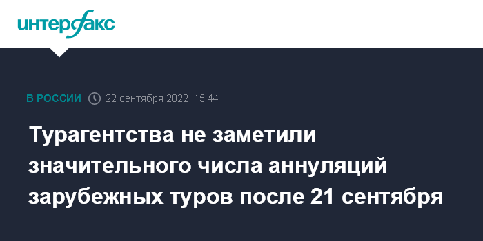 Москва. 22 сентября. INTERFAX.RU - В турагентствах в Москве и регионах не фиксируют значительного числа аннуляций зарубежных туров после объявления частичной мобилизации, но новые бронирования приостановились, сообщила "Интерфаксу" в четверг пресс-секретарь Российского союза туриндустрии (РСТ) Ирина Тюрина.