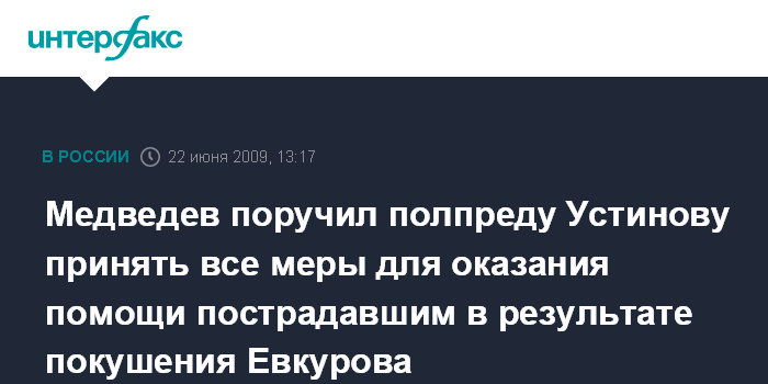 Москва. 22 июня. INTERFAX.RU - Президент РФ Дмитрий Медведев поручил своему полномочному представителю в ЮФО Владимиру Устинову предпринять все необходимые меры по оказанию помощи пострадавшим и семьям погибших в результате покушения на президента Ингушетии. Об этом сообщила пресс-секретарь главы государства Наталья Тимакова.