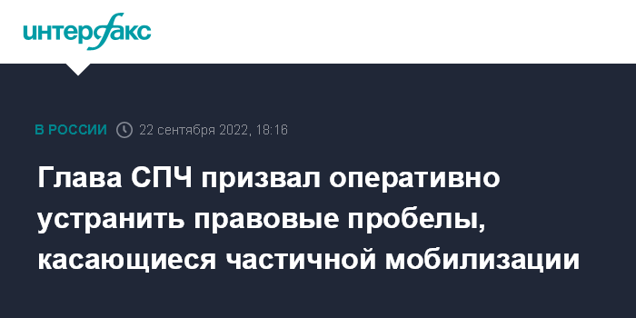 Москва. 22 сентября. INTERFAX.RU - Председатель Совета при президенте РФ по правам человека (СПЧ) Валерий Фадеев заявил, что необходимо оперативно устранить правовые пробелы, которые связаны с объявлением частичной мобилизации в России.