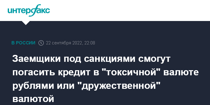 Москва. 22 сентября. INTERFAX.RU - ЦБ РФ в случае введения санкций в отношении банка или его заёмщика рекомендует предусмотреть погашение кредита в рублях или валюте дружественных стран.