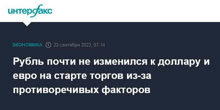 Москва. 23 сентября. INTERFAX.RU - Изменения доллара США и евро на Московской бирже на старте торгов в пятницу утром незначительные, рубль демонстрирует боковую динамику на фоне противоречивых внутренних и внешних факторов.