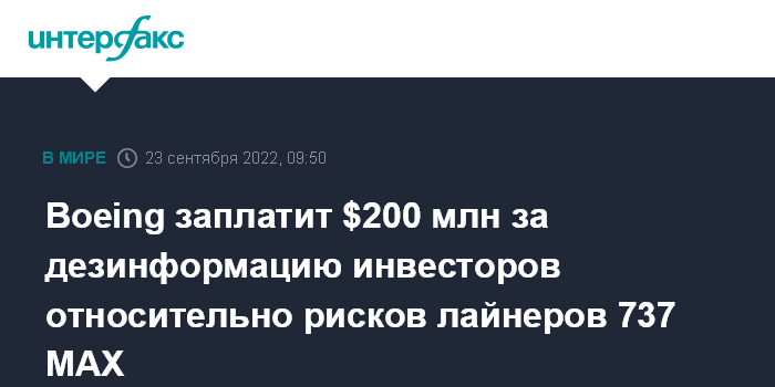 Москва. 23 сентября. INTERFAX.RU - Boeing Co. заплатит $200 млн для урегулирования претензий Комиссии по ценным бумагам и биржам (SEC) США, обвинившей компанию в дезинформации инвесторов относительно степени безопасности самолетов 737 MAX.