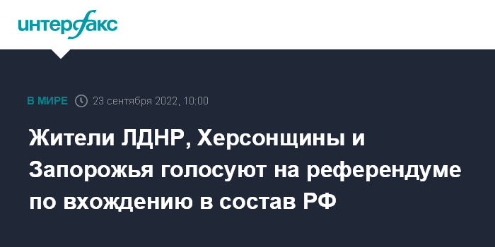 Москва. 23 сентября. INTERFAX.RU - В Донецкой и Луганской народных республиках, Херсоне и Запорожье началось голосование на референдуме по вхождению в состав России.