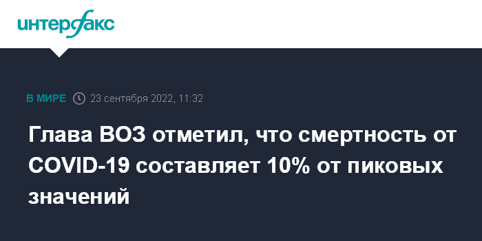 Москва. 23 сентября. INTERFAX.RU - Количество летальных исходов от заражения COVID-19 продолжает снижаться и составляет всего 10% от пика смертности в январе 2021 года, заявил "на полях" Генассамблеи ООН в Нью-Йорке глава Всемирной организации здравоохранения (ВОЗ) Тедрос Адханом Гебрейесус.