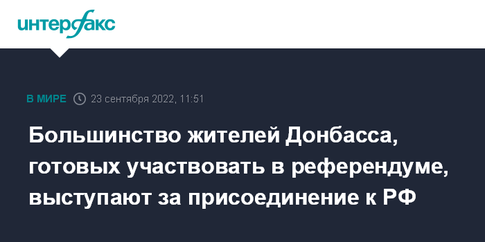 Москва. 23 сентября. INTERFAX.RU - Подавляющее большинство жителей Донецкой и Луганской народных республик (по 87% в ДНР и ЛНР соответственно) готовы принять участие в референдуме по вопросу территориальной принадлежности, свидетельствуют данные опроса ВЦИОМ, опубликованные в пятницу на официальном сайте социологического института.