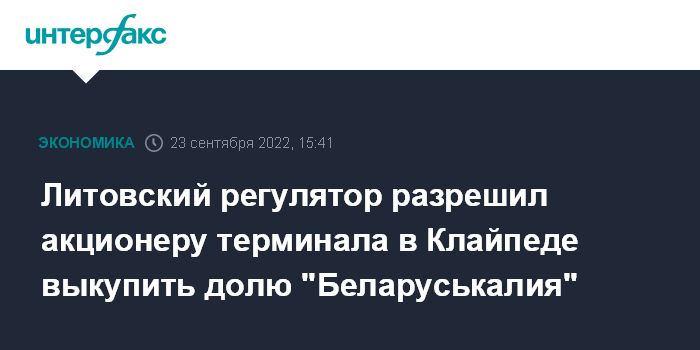 Москва. 23 сентября. INTERFAX.RU - Игорь Удовицкий, крупнейший акционер Клайпедского терминала навалочных грузов (Biriu kroviniu terminalas, BKT), который ранее переваливал удобрения подпавшего под западные санкции "Беларуськалия", получил одобрение литовского регулятора на покупку 30% контролируемых "Беларуськалием" акций BKT.