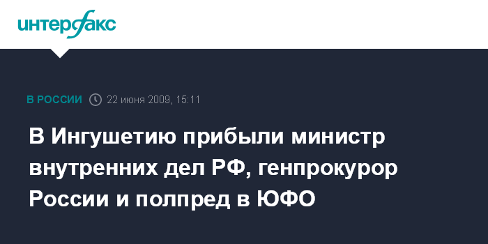 Назрань. 22 июня. INTERFAX.RU - В Ингушетию прибыли глава МВД России Рашид Нургалиев, полпред президента РФ в Южном федеральном округе Владимир Устинов и генеральный прокурор РФ Юрий Чайка.