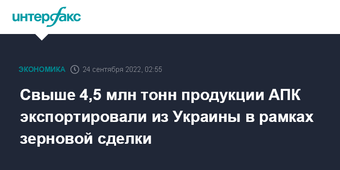 "По состоянию на 23 сентября общий тоннаж зерна и другой агропродукции, экспортированных из трех украинских портов, составляет 4 556 311 тонн. Всего на данный момент было разрешено движение 420 судов - 217 на прибытие в украинские порты и 203 - на выход из них", - говорится в сообщении.