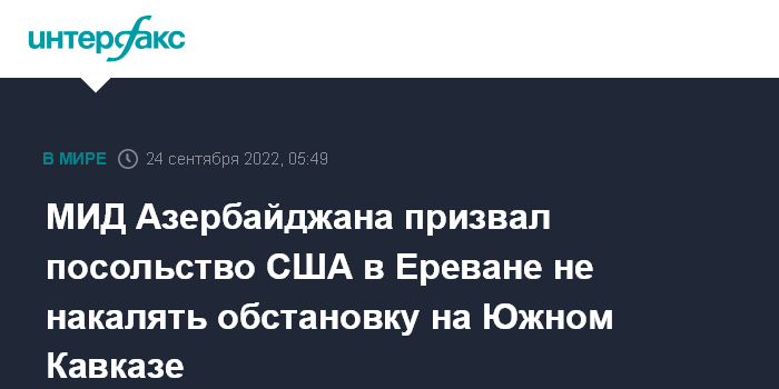 Москва. 24 сентября. INTERFAX.RU - МИД Азербайджана призвал посольство США в Армении воздержаться от односторонних заявлений с оценкой ситуации на Южном Кавказе.