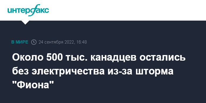 Москва. 24 сентября. INTERFAX.RU - Около 500 тыс. жителей атлантических провинций Канады остались без электроэнергии из-за удара тропического шторма "Фиона", сообщает в субботу агентство Associated Press.