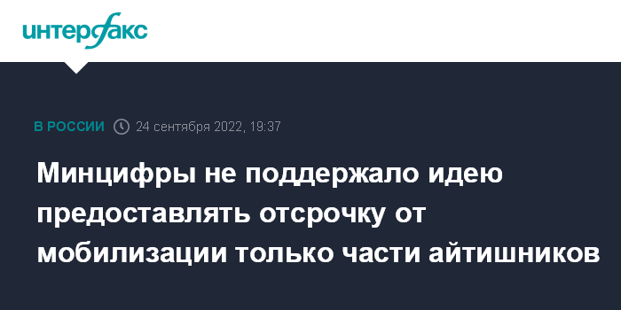 Москва. 24 сентября. INTERFAX.RU - Минцифры не поддерживает предложения председателя Совета при президенте РФ по правам человека Валерия Фадеева о предоставлении отсрочки в рамках частичной мобилизации только сотрудникам в сфере IT, работающим с технологиями военного назначения, говорится в сообщении министерства.