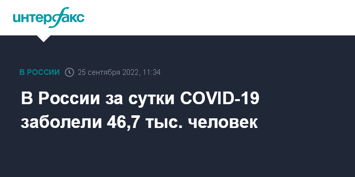 Москва. 25 сентября. INTERFAX.RU - Суточный прирост новых заболевших коронавирусной инфекцией в РФ составил 46 758 случаев, следует из данных оперативного штаба, обнародованных в воскресенье.