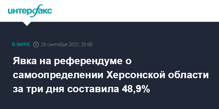 Москва. 25 сентября. INTERFAX.RU - За три дня голосования на референдуме о самоопределении Херсонской области участие в нем приняли 48,91% списочного состава избирателей, сообщила журналистам председатель избиркома Херсонской области Марина Захарова.