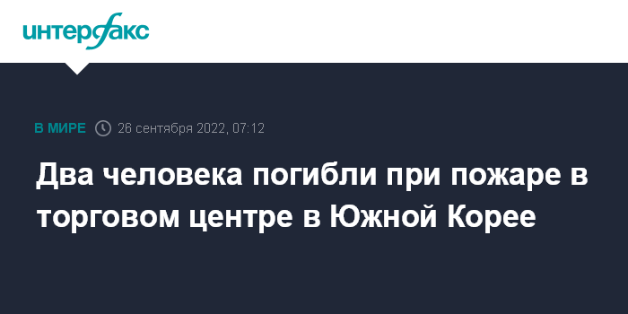 Москва. 26 сентября. INTERFAX.RU - Два человека погибли, один пострадал при пожаре в южнокорейском городе Тэджон, сообщает Yonhap.