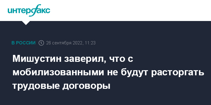 Москва. 26 сентября. INTERFAX.RU - Трудовые договоры с призванными по мобилизации расторгаться не будут, их действие будет приостанавливаться, а рабочее место за мобилизованными сохранится, заявил премьер-министр РФ Михаил Мишустин.