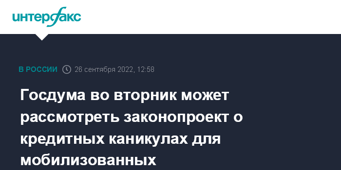 Москва. 26 сентября. INTERFAX.RU - Комитет Госдумы по финансовому рынку рекомендовал Совету Думы включить на 27 сентября в повестку работы парламента для рассмотрения в первом чтении законопроект о предоставлении кредитных каникул по ипотечным и потребительским кредитам мобилизованным гражданам.