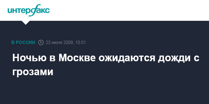 Москва. 23 июня. INTERFAX.RU - Ближайшей ночью в столице пройдут сильные дожди с грозами, сообщили во вторник "Интерфаксу" в Гидрометеобюро Москвы и Московской области.