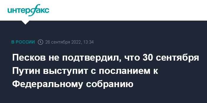 Песков не подтвердил, что 30 сентября Путин выступит с посланием к Федеральному собранию