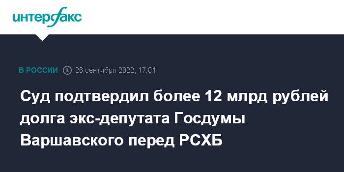 Москва. 26 сентября. INTERFAX.RU - Арбитражный суд Московского округа согласился с обоснованностью требования Россельхозбанка к бывшему депутату Госдумы и бизнесмену Вадиму Варшавскому в размере около 12,2 млрд рублей. Как следует из картотеки суда, суд отклонил кассационную жалобу предпринимателя.