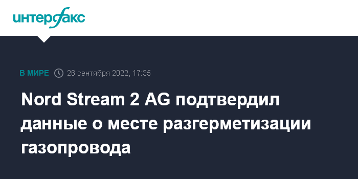 Москва. 26 сентября. INTERFAX.RU - Оператор газопровода "Северный поток 2" Nord Stream 2 AG, который ранее в понедельник сообщил об утечке газа, подтвердил данные датского регулятора о месте разгерметизации.