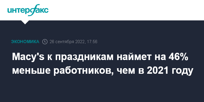 Москва. 26 сентября. INTERFAX.RU - Американская сеть универмагов Macy's Inc. планирует в 2022 году в преддверии рождественских праздников нанять чуть более 41 тысячи сезонных работников, сообщила компания.