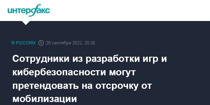 Москва. 26 сентября. INTERFAX.RU - Глава Минцифры РФ Максут Шадаев заявил, что сотрудники отрасли разработки игр (GameDev) и кибербезопасности имеют право претендовать на получение отсрочки от частичной мобилизации.