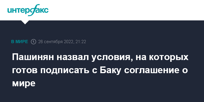 Москва. 26 сентября. INTERFAX.RU - Армения готова подписать соглашение о мире с Азербайджаном на основе совместного признания государственных границ в рамках соглашения о провозглашении Содружества независимых государств, заявил премьер-министр Армении Никол Пашинян.