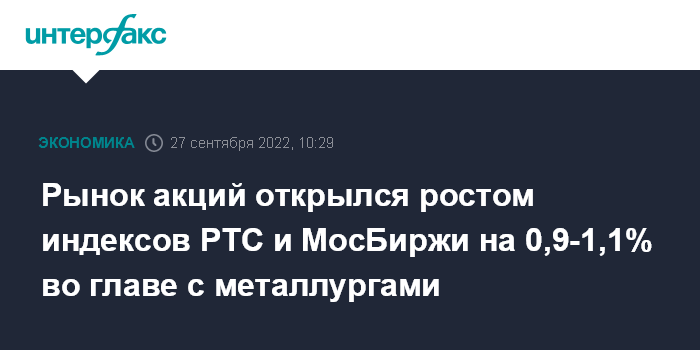 Москва. 27 сентября. INTERFAX.RU - Рынок акций РФ открылся во вторник коррекционным ростом цен blue chips на фоне улучшения внешней фондовой и сырьевой конъюнктуры (растут нефть и металлы) после недавнего падения; индексы РТС и МосБиржи за минуту торгов прибавили 0,9-1,1%, при этом лидируют акции металлургических компаний.