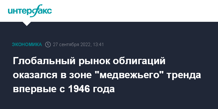 Москва. 27 сентября. INTERFAX.RU - Мировой рынок гособлигаций пытается стабилизироваться 27 сентября после падения по итогам предыдущей сессии. Падение рынка с начала 2022 года превышает 20%, что говорит о "медвежьем" тренде, который, по данным Deutsche Bank, отмечен впервые за 76 лет.