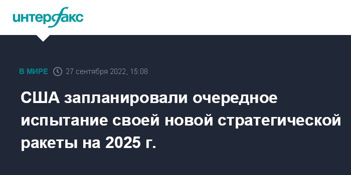 Москва. 27 сентября. INTERFAX.RU - Очередной испытательный пуск новой американской межконтинентальной баллистической ракеты (МБР) LGM-35 Sentinel, способной нести разделяющуюся головную часть с несколькими ядерными боеголовками, планируется провести в конце лета - начале осени 2025 года, следует из данных Пентагона.